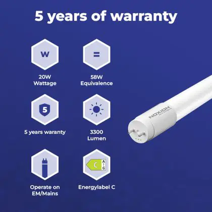 Quando passi a LED è importante controllare il wattaggio e la lunghezza del tubo da sostituire. Questo tubo LED di 20W sostituisce un tubo convenzionale di 58W con una lunghezza di 1514mm. Questo tubo può farti risparmiare più del 50% in costi di energia se è comparato con un tubo fluorescente tradizionale.