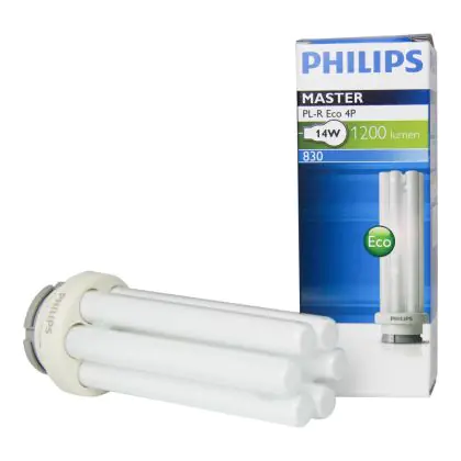 Le Philips PL-R Eco 14W 840 4P (MASTER) sono lampade fluorescenti compatte più efficienti delle classiche lampade a basso consumo. Queste lampade sono un'ottima scelta in termini di rispetto dell'ambiente anche perché hanno una lunga vita di ben 24.000 ore e presentano un limitato contenuto di mercurio. Esse inoltre assicurano performance ottimali di illuminazione con stabilità del flusso luminoso. L'attacco di queste lampade é del tipo GR14q-1 ed é dotato di 4 pin (perni). La potenza di tali lampade é di 14W.