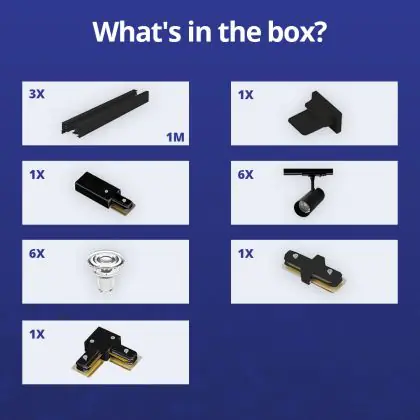Descrizione Set completo 1-Fase Rail L 1 x 2 Metro Nero | incl. 6x Faretti + GU10 2700K 3W Dimmerabile + Tappo Di Chiusura, Connettore di Alimentazione e L -Connettore